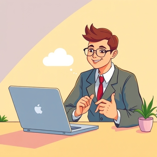 商務人士輕鬆存取雲端軟體的生動插圖,溫暖光線營造歡樂氛圍