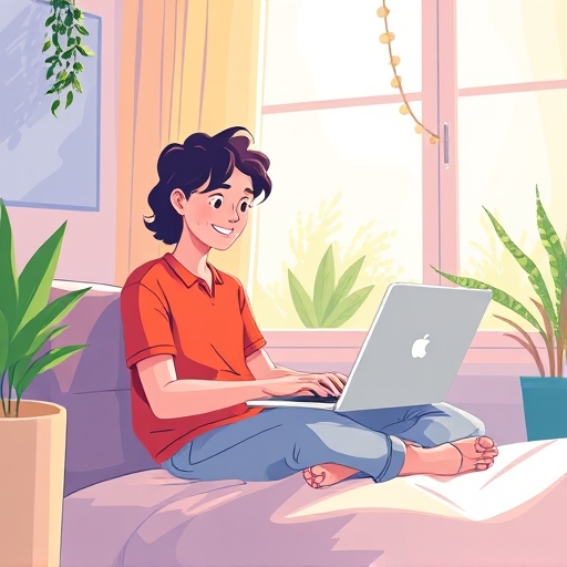 在家網路兼職的自由機會,一個人快樂地使用筆電工作,周圍充滿自然光線與活力色彩