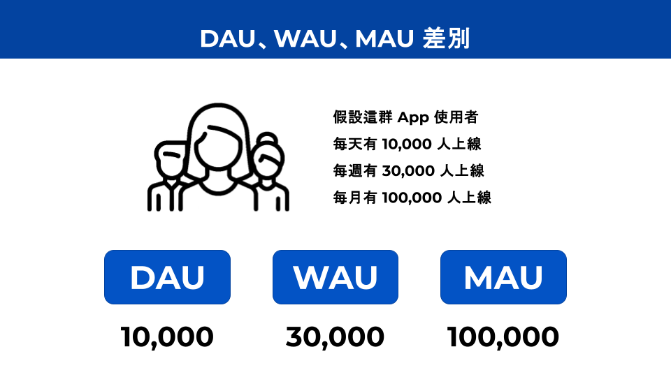 DAU 是每天有多少不同的人使用軟體;WAU 是每週有多少不同的人使用軟體;MAU 是每月有多少不同的人使用軟體。
