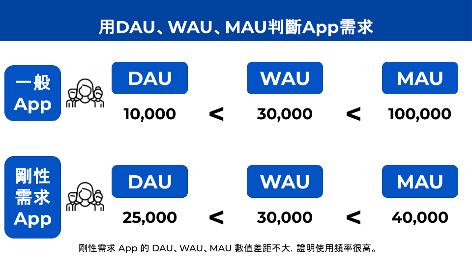 一般來說這 3 種數據的數值會是 MAU > WAU > DAU。