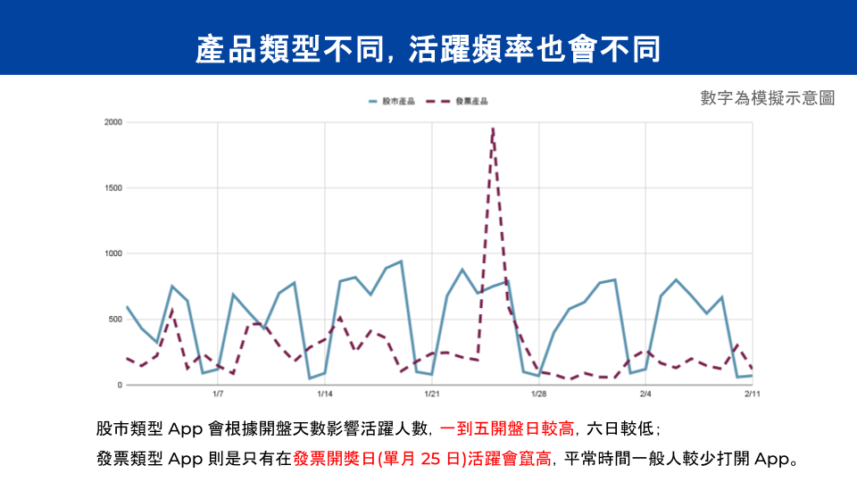 同理,如果有些產品有特別的使用頻率或行為,例如股市類 App 因為假日沒有開盤,所以用 DAU 去看假日都會比平日低很多,而股市又是每周一循環,因此用 WAU 來觀察會比較好。